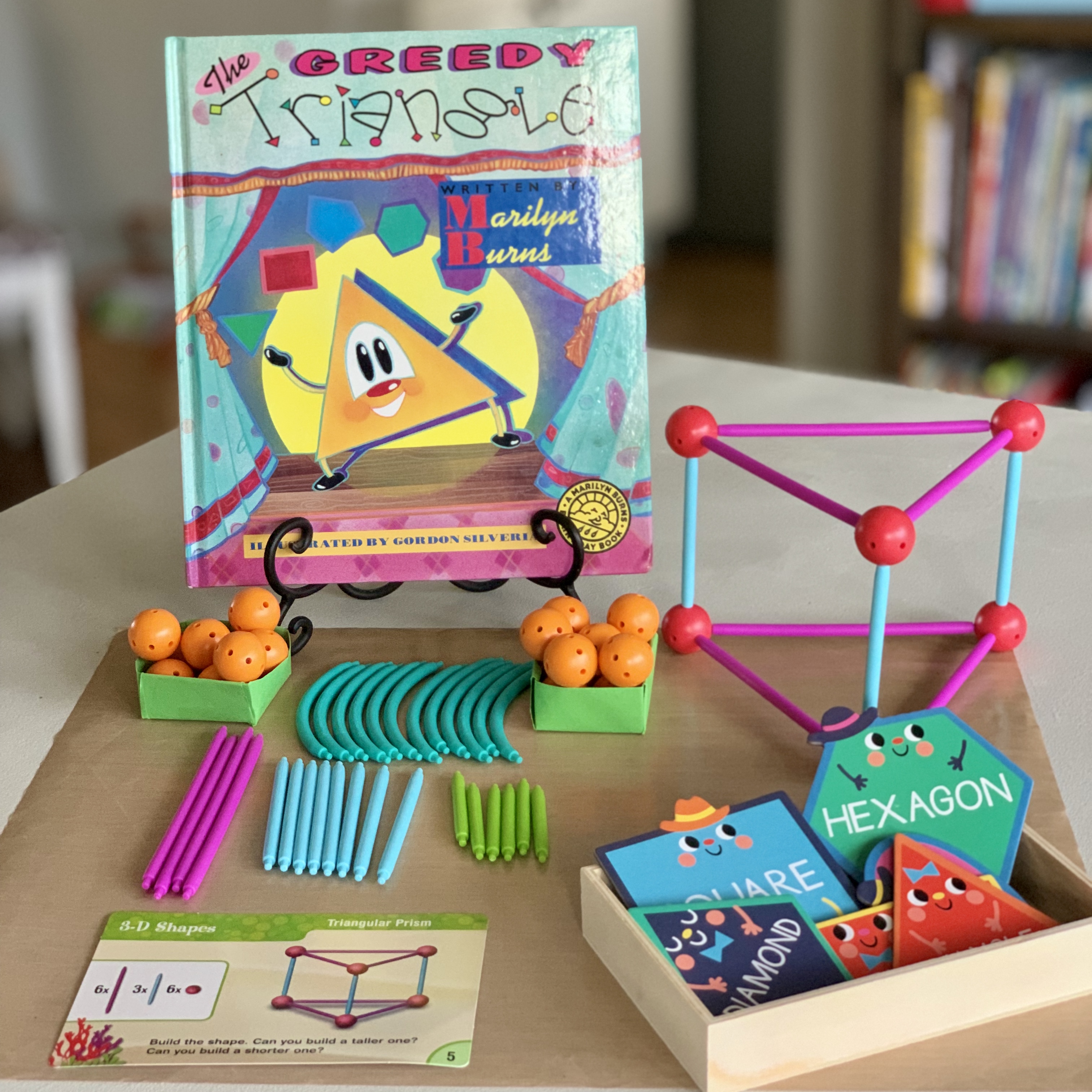 As kids refine their building skills and become better spatial problem-solvers you can add task cards to an activity. In the activity above, I used a Learning Resources Build Geometry Set, I found at the Target Dollar Spot similar to the one in the link above. My son and the second graders I tutor enjoy using the set to make the shapes on the task cards. They build as I read a shape book to them, then we discuss the attributes of the shapes they make. We spent one building session just discussing the different kinds of triangles, their names, angles, and orientation. Kids are comfortable with equilateral triangles that sit on a side but are less sure about triangles when they are scalene and “upside down”. They need time working with and building many types of triangles to be able to discuss what makes a triangle a triangle confidently.