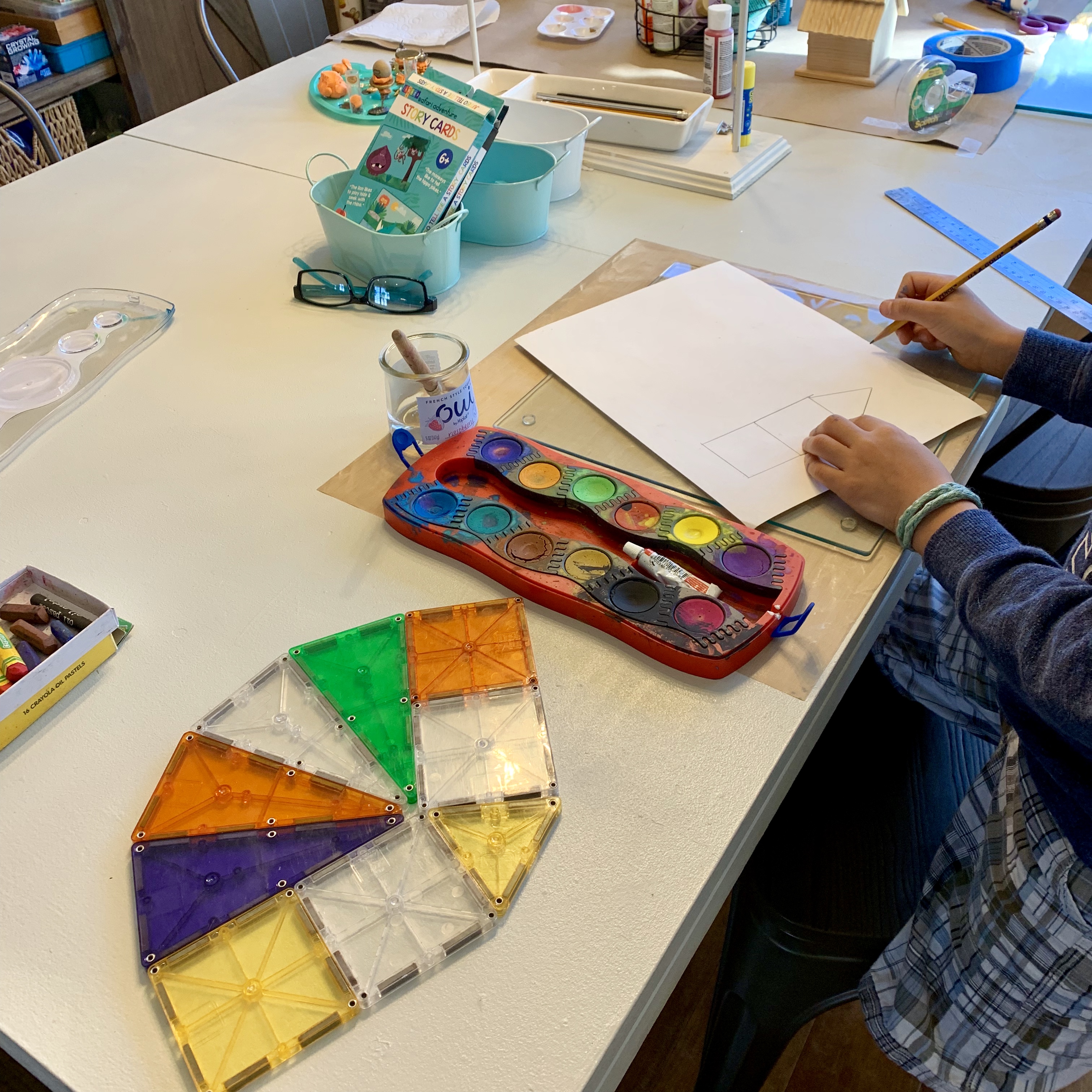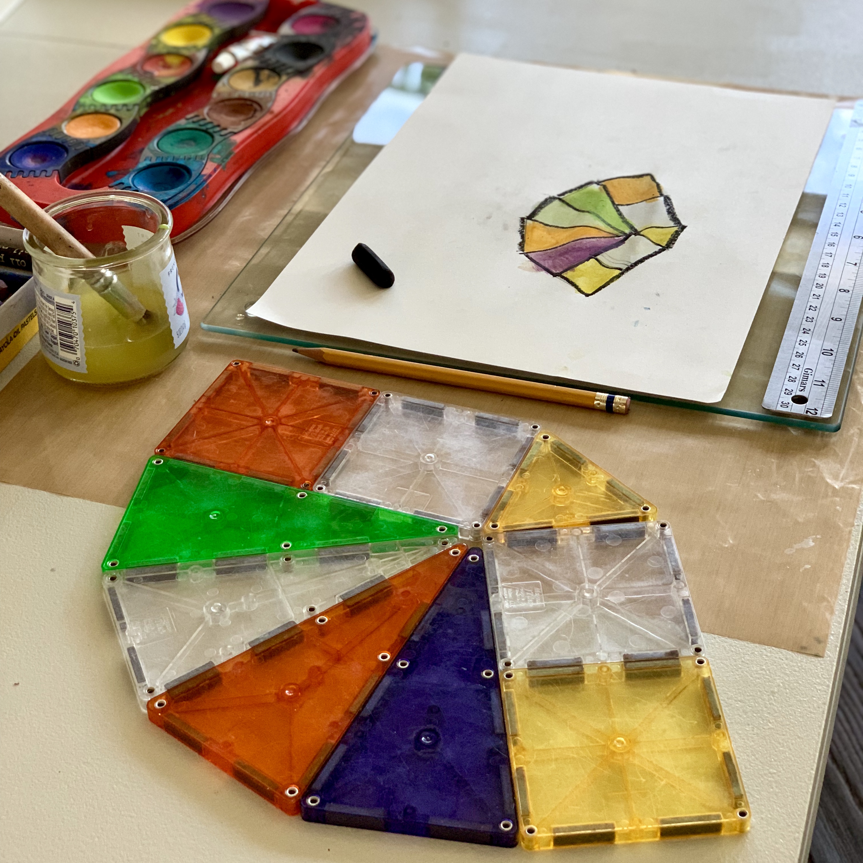 Children enjoy using colorful magnetic tiles to create designs. My kids like making big 3-dimensional builds, like castles or spaces ships. They also like to make flat designs. In this invitation, I asked my 7-year-old son to make a flat design and then to draw it on a piece of paper. He often makes very large designs but the task of copying his design onto paper was challenging so he made a smaller design. In this activity, his visual and spatial skills were put to work and he had to problem solve. It took him several pieces of paper and some frustration to be able to copy his design. He had to figure out how to draw his composite shape using the tile shapes. He had to pay attention to the angles and orientation of the shapes in his design.
