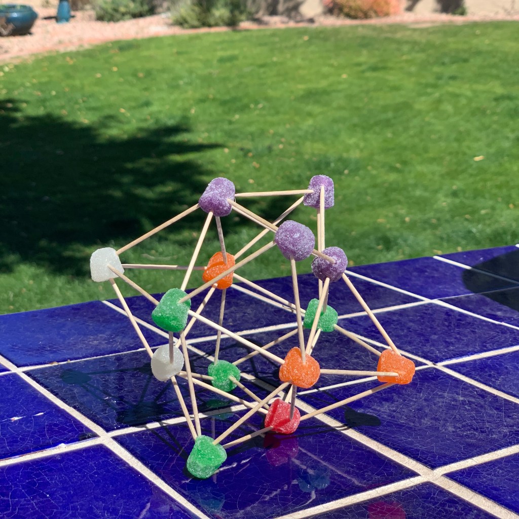 Last month we went to ASU’s Open Door event. Arizona State University invites the community to come see and hear about what the students and faculty are working on. It is very oriented toward kids and teens and every department has hands-on activities for kids. We found this fun build a tetrahedron with gum drops and toothpicks at the math department. My kids enjoyed it so much, they asked to have more mini-building challenges at home.